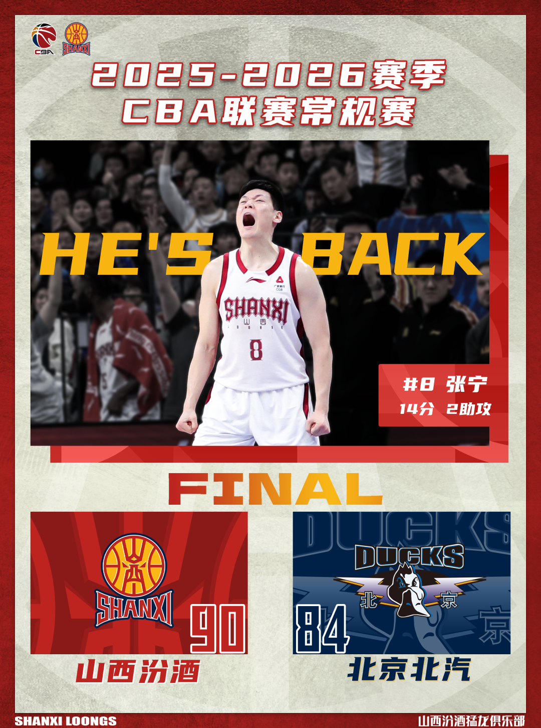 北京时间2026年1月16日19:35,2025-2026赛季CBA联赛常规赛第15轮继续进行,山西汾酒客场挑战北京北汽。两队历史上共交手52次,山西汾酒18胜34负;上赛季两队交手5次,山西汾酒2胜3负。本场比赛,山西队背负巨大压力,开局依旧慢热,进攻端畏首畏尾,一度陷入停滞。经教练组调整后,全队团结一致、力拼防守,始终紧咬比分,末节关键时刻展现出足够韧劲,最终成功取胜。全场比赛结束,山西汾酒90:84战胜北京北汽。